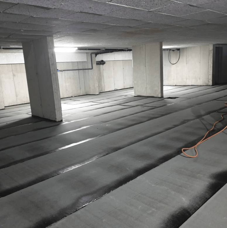 Der Untergrund aus beton wurde geschliffen, Fugen und Risse mit einem Schleppstreifen abgedeckt.